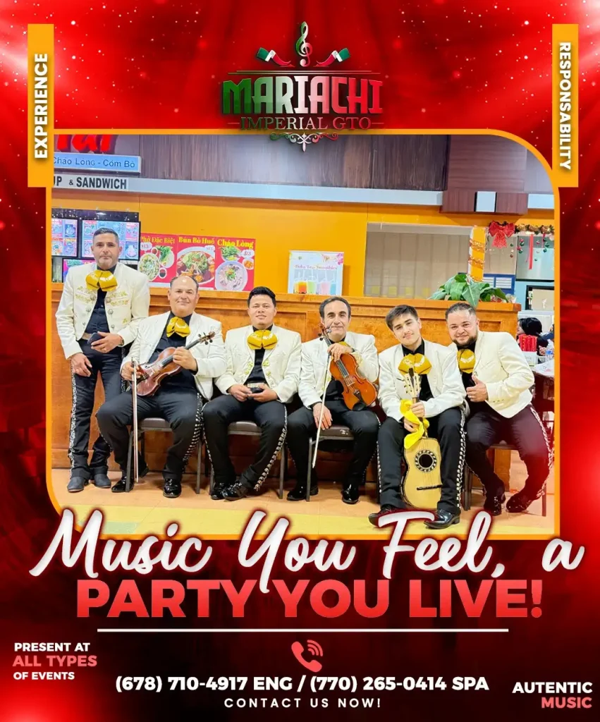 At Mariachi Imperial GTO, we bring the authentic sound of Mexico to every celebration. With over 25 years of experience, our professional mariachi group delivers powerful, emotional, and unforgettable performances for weddings, quinceañeras, birthdays, serenades, masses, funerals, and corporate events. Available 24/7, we proudly serve Winder, GA, and offer free travel up to 150 miles. Every presentation is filled with passion, elegance, and the truly imperial mariachi sound that sets us apart.